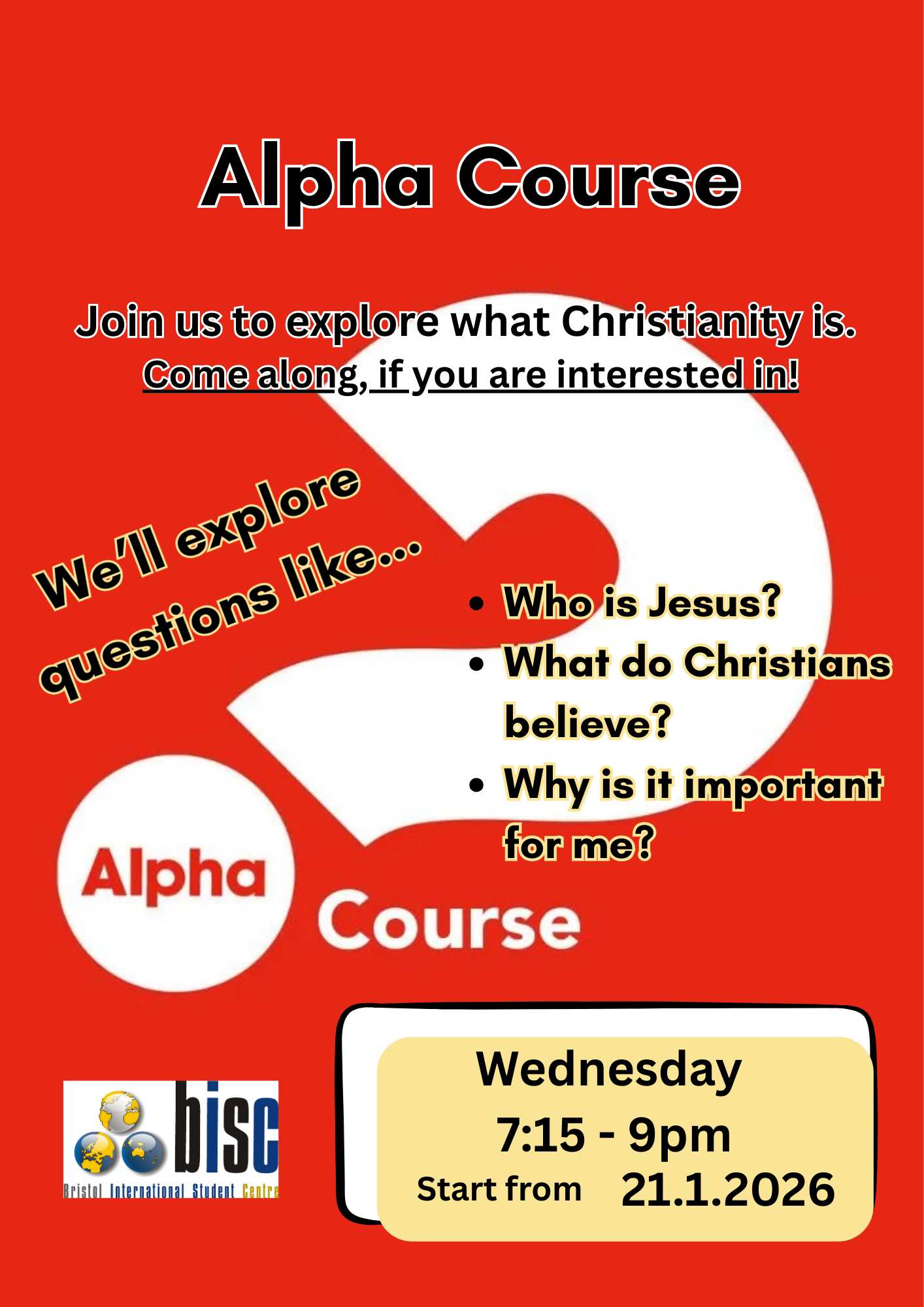 It is a journey to explore faith and you don’t need any Christian knowledge, just need a bit of interest. Videos followed by many discussions in a informal and chill atmosphere :)